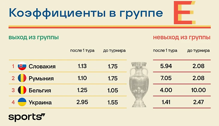 Словаки и румыны своими успехами мощно прогнули коэффициенты на выход из группы. Особенно хорошо тем, кто верил в Словакию до старта: коэффициент был приятный, а для плей-офф теперь должно хватить всего одного очка в матчах против румын и украинцев.