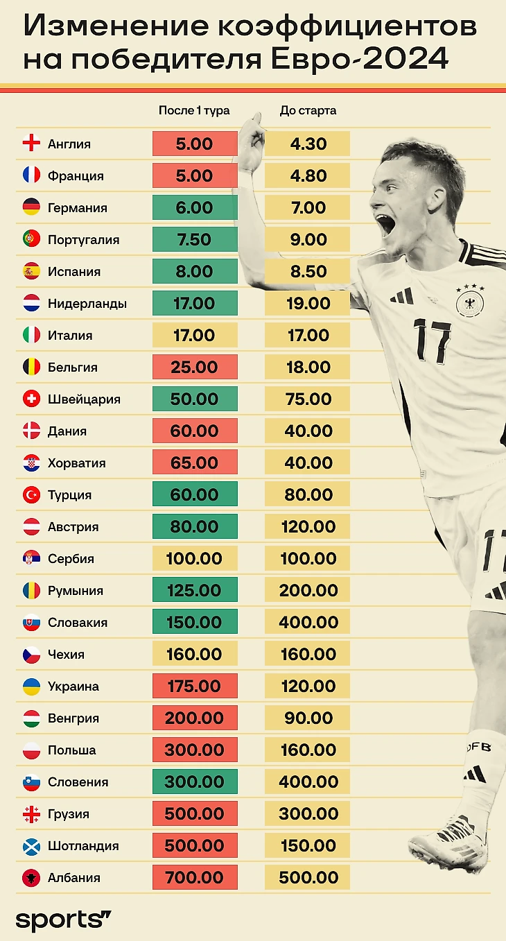Мы знаем предстартовые коэффициенты и видим, как они изменились после первых матчей всех сборных на Евро-2024.