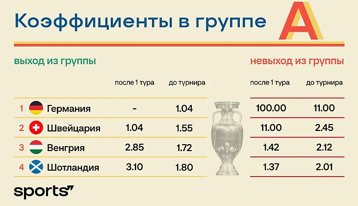 В выходе Швейцарии уже нет никаких сомнений, а у Венгрии коэффициент увеличился заметно. В шотландцев вообще не верят, хотя с главным фаворитом группы они уже сыграли – правда, разницу сильно подпортили.