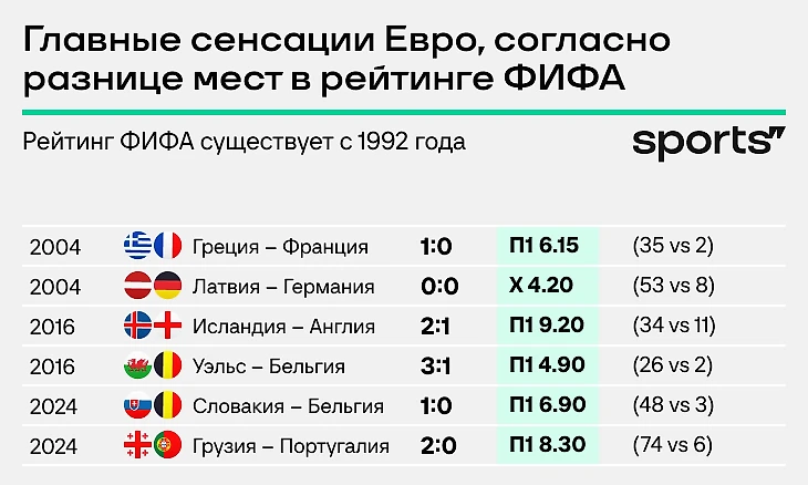 Грузия не только сотворила суперсенсацию, но и поставила исторический рекорд турнира: 74-я команда в рейтинге ФИФА обыграла шестую – между ними сразу 68 позиций! Такого еще не было никогда.