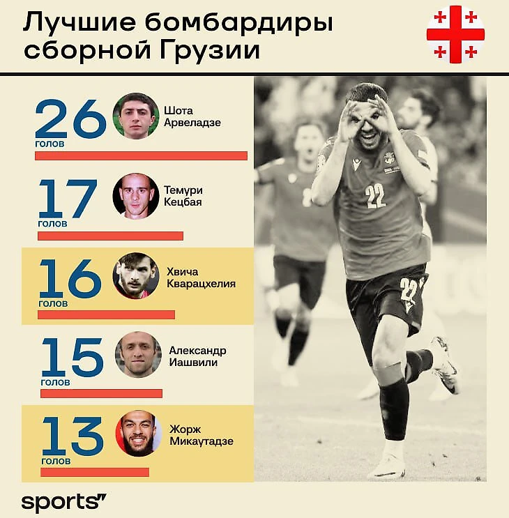 А сам Жорж забил уже тринадцатый гол в национальной команде. На это потребовалось 27 матчей. Благодаря трем голам на Евро-2024 основной грузинский нападающий взлетел уже в топ-5 в историческом списке бомбардиров сборной.