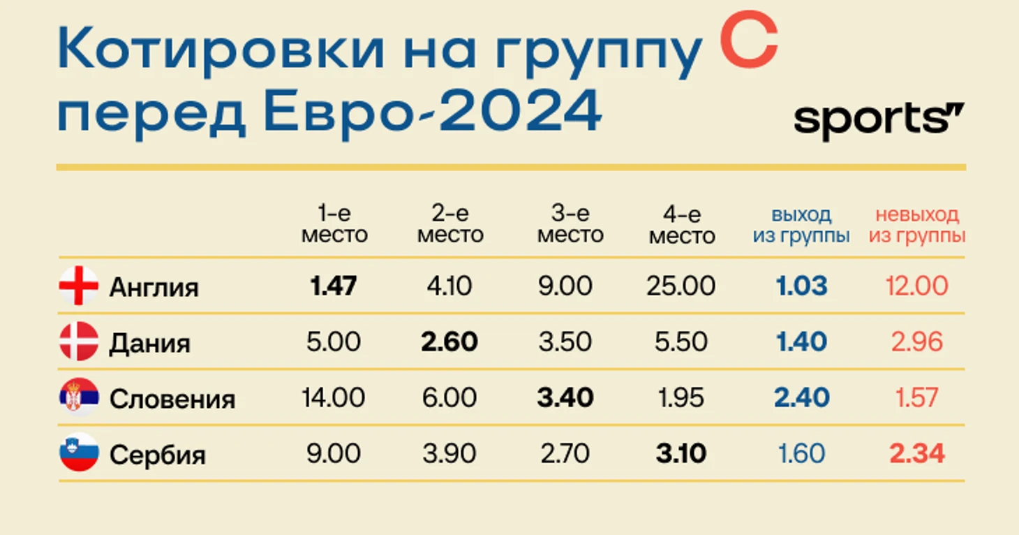Единственный мини-сюрприз – прорыв Словении. Команда Матьяжа Кека шла четвертой по котировкам. Считалось, что Дания и Сербия поборются за вторую позицию, но в итоге словенцы спасли ничью в первой встрече, затем упустили победу во второй и насладились английским футболом в третьем. Словения впервые в истории выходит в плей-офф Евро. Коэффициент на третье место был 3.40.