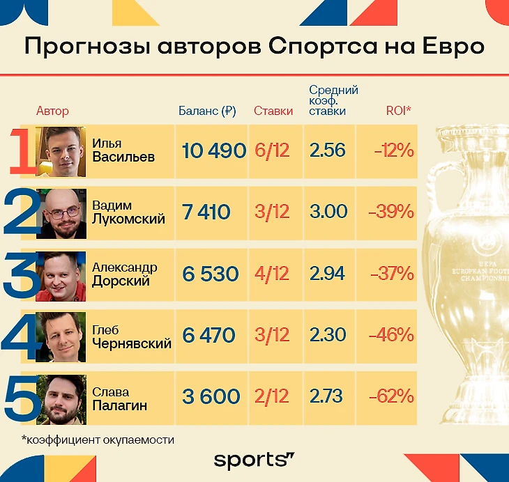 С нами Илья Васильев, Александр Дорский, Вадим Лукомский, Вячеслав Палагин и Глеб Чернявский. Васильев укрепил лидерство, а Чернявский снова сделал точный прогноз! В фокусе – последний игровой день группового этапа: Грузия – Португалия, Бельгия – Украина и Румыния – Словакия.
