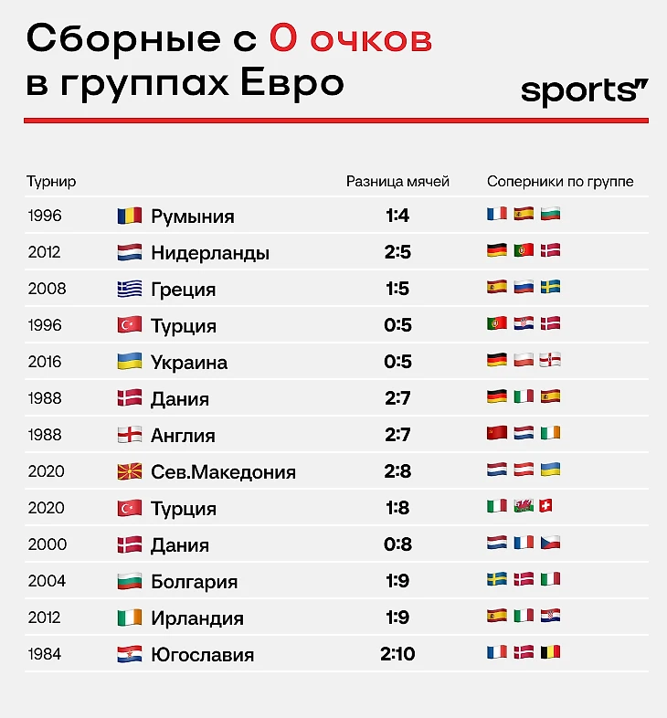 А за все время существования группового этапа на Евро – за 12 таких турниров – было 13 команд, которые не набрали ни одного очка за три матча.