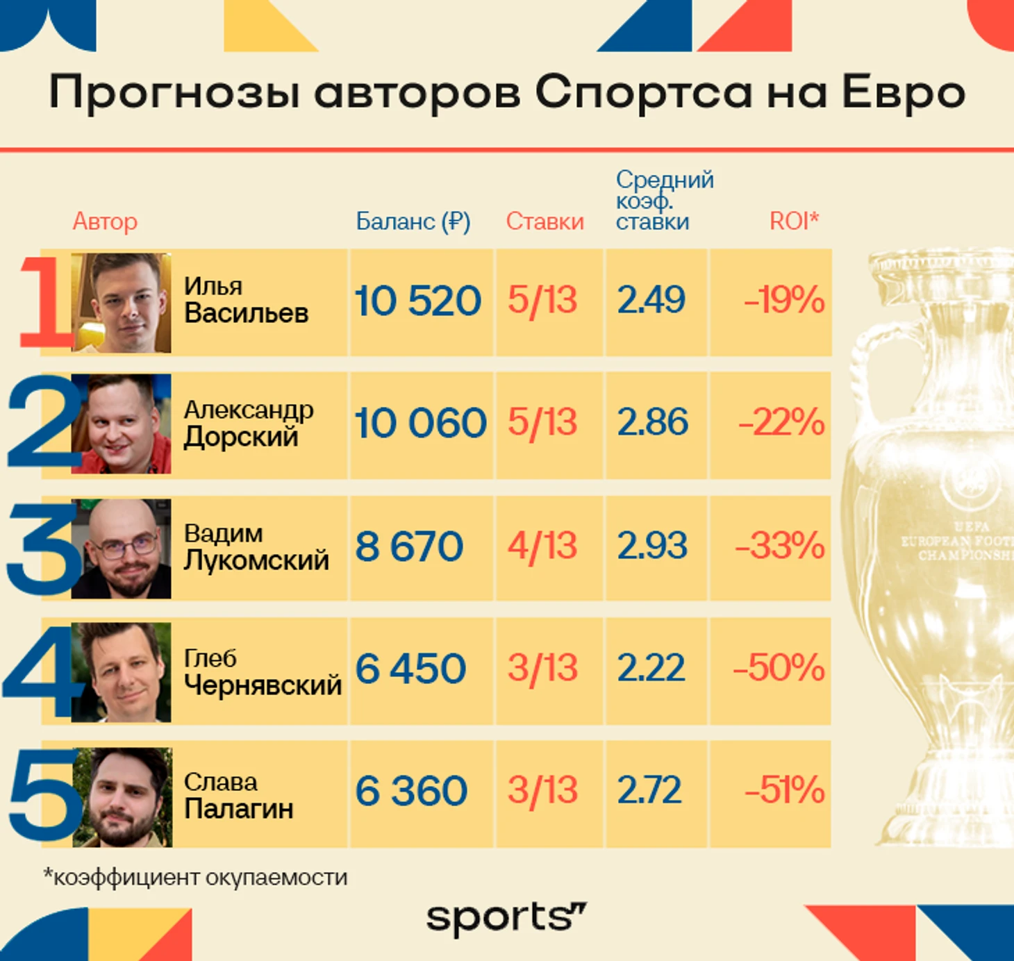 По итогам группового этапа (мы все пересчитали) к Илье Васильеву максимально приблизился Александр Дорский. У него три попадания в шести последних игровых днях. Самая крупная ставка зашла у Ильи – победа Италии с голом Албании при коэффициенте 2.84.