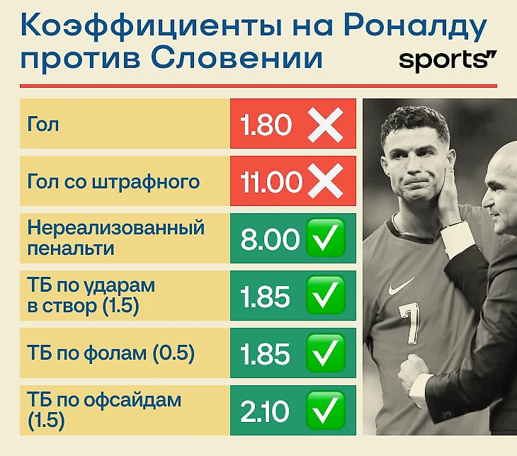● По пенальти сработал совсем не тот коэффициент, что ждали – 8.00 за нереализованный. Традиционно не заходит гол со штрафного – на забитый мяч просто не дают котировки. А если у Роналду вдруг получится, пройдет 7.00.
