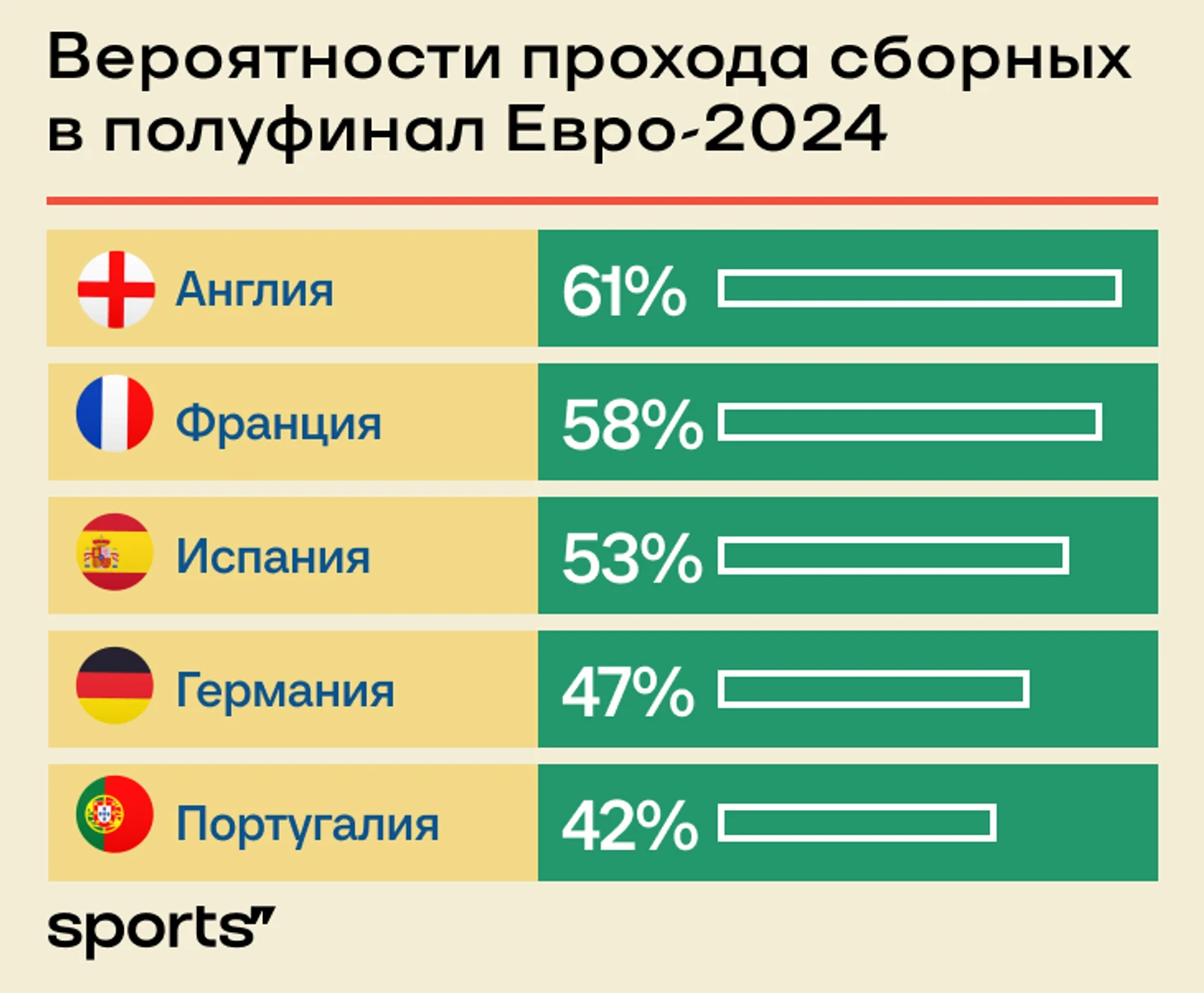 Итак, не забываем про цифры четвертьфиналов. Англия выходит в полуфинал с вероятностью в 61%, а Испания – только 53%, но далее новая стадия, где потенциально Англия снова получит соперника значительно легче.