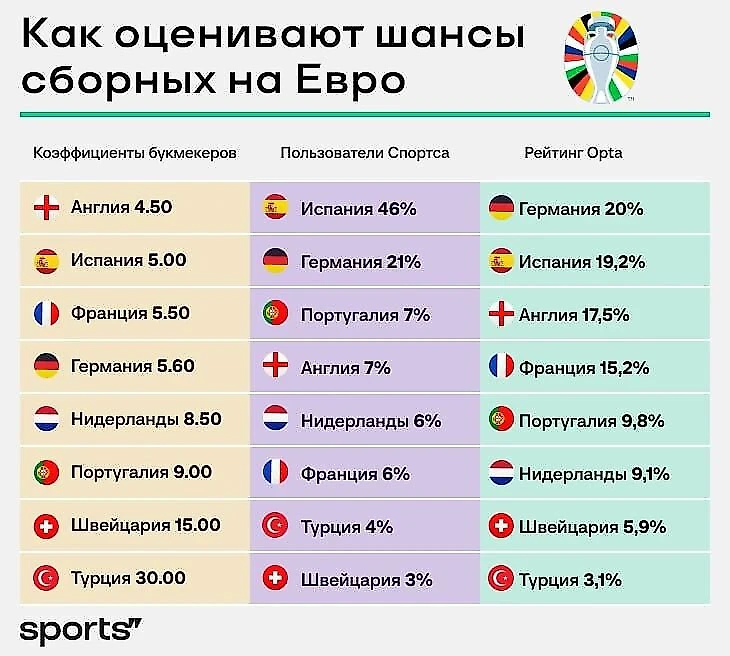Таким образом, Англия ни при каких раскладах не покинет первую строчку фаворитов до финала, если продолжит побеждать. А там уже наверняка перестанет быть главным претендентом, если до решающего матча дойдут Испания, Германия и, вероятно, Франция.