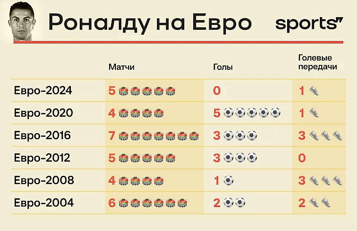 До Евро-2024 худшее выступление Криштиану на турнире – 2012-й. Тогда забил три мяча, остался без голевых. Остальные турниры с 2004-го – не меньше четырех результативных действий.