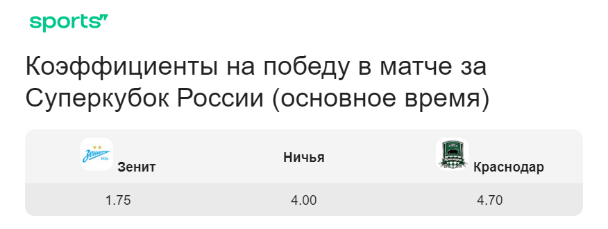 «Зенит» – заслуженный фаворит встречи. На петербуржцев дают 1.75. Коэффициент на «Краснодар» выше почти в 2,5 раза – 4.70.