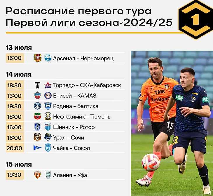 Матчи первого тура пройдут 13-15 июля. Из тройки фаворитов начнут «Урал» и «Сочи», причем против друг друга. В этой игре фаворитами считаются екатеринбуржцы.