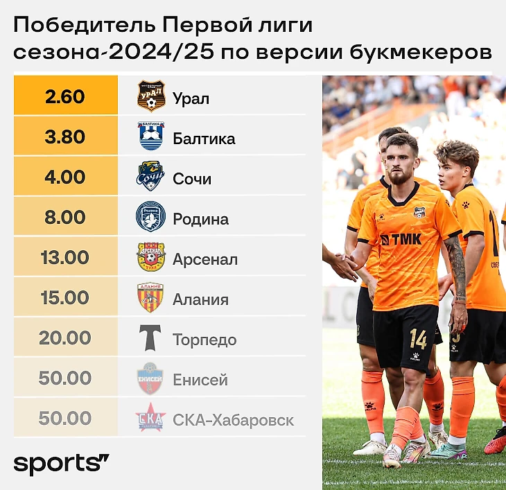 Экс-участники РПЛ традиционно считаются фаворитами, поэтому самыми низкими коэффициентами букмекеры наградили «Урал», «Балтику» и «Сочи».