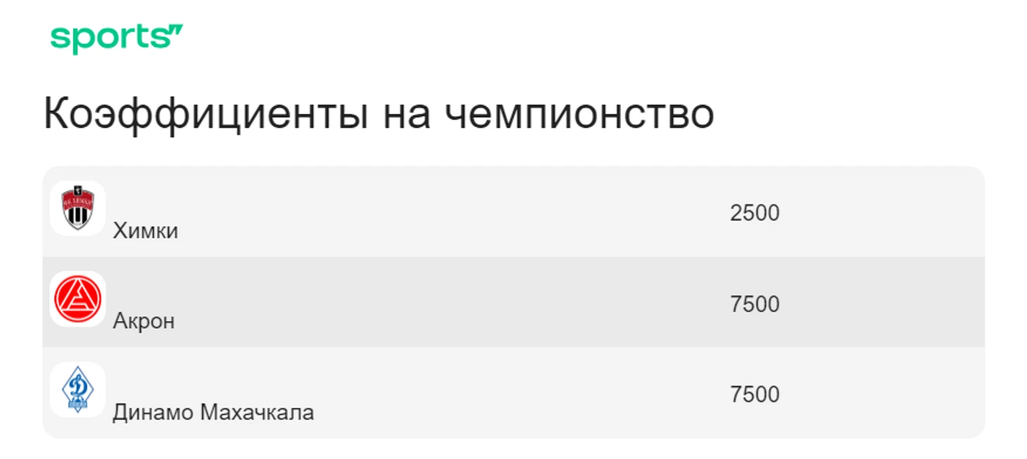 На чемпионство ожидаемо выставлены аномальные котировки – по 7500. Еще ни одному клубу в истории РПЛ не удалось сходу стать чемпионом.