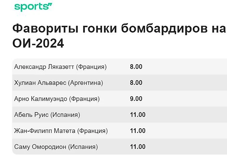 Удивительная плотность и в линии на лучшего бомбардира футбольной Олимпиады. Здесь букмекеры словно взяли, да и добавили всех атакующих игроков из трех лучших сборных примерно в одном диапазоне коэффициентов. Ляказетт и Альварес получили 8.00; в тройку вошел француз Арно Калимуэндо; за 11.00 идут Абель Руис, Жан Матета и Саму Омородион. Первый и единственный представитель страны, не входящей в топ-3 турнира, – загадочный американец Данкан Макгуайр за коэффициент 25.00.