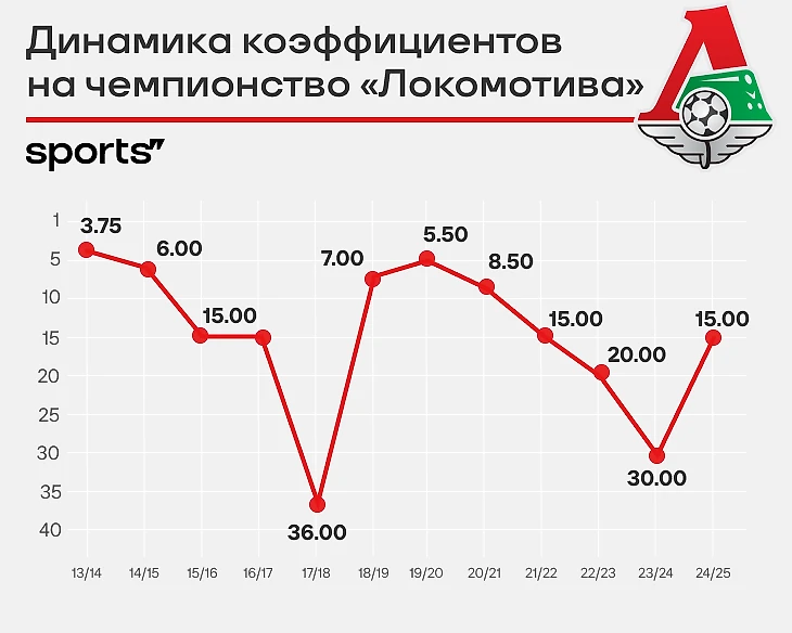Такая стратегия не повысила шансы на титул. Если первые три сезона после чемпионства коэффициент на «Локо» не поднимался выше 10, то в 2021 году он вырос до 15.00.