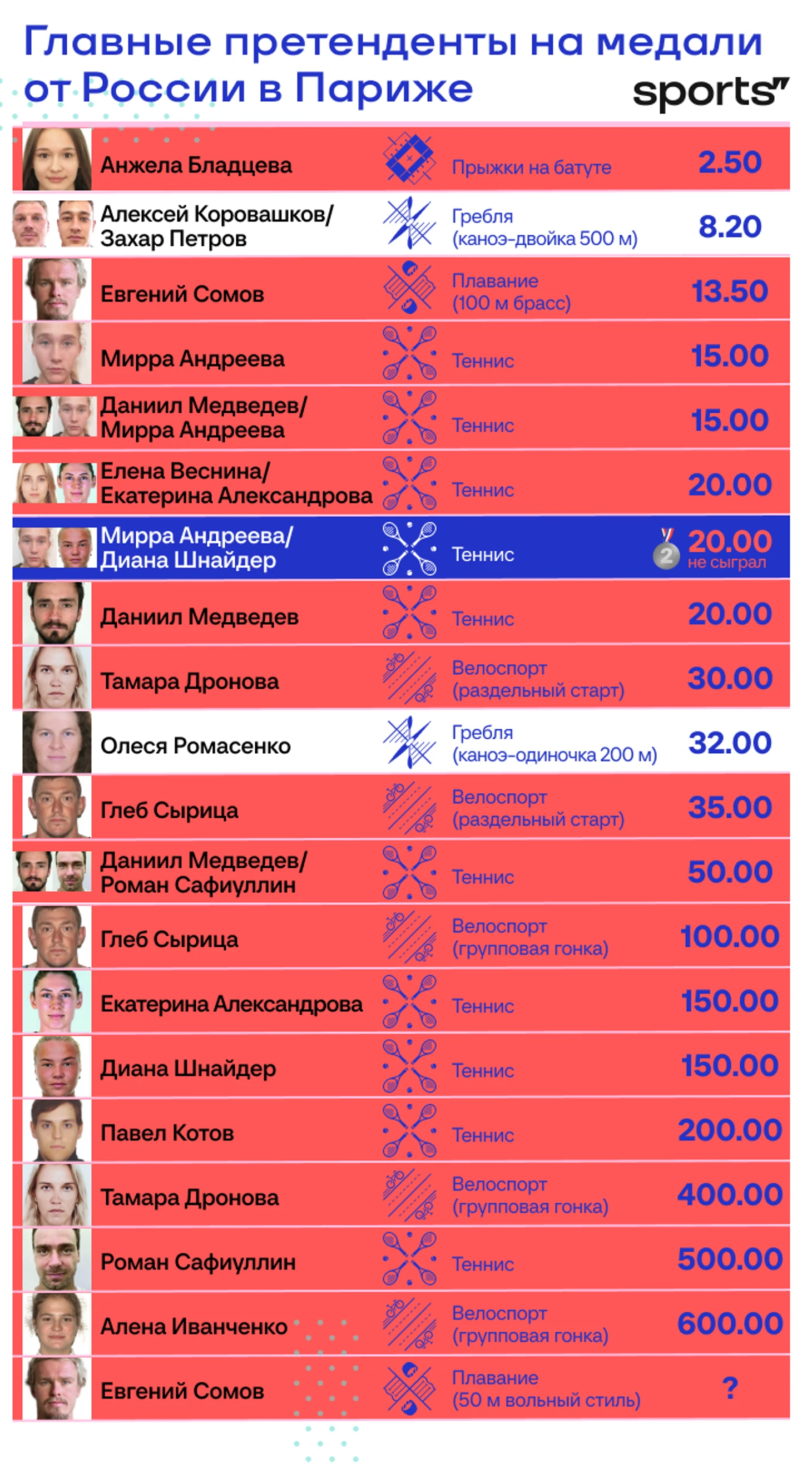 Одно из главных разочарований – вылет Андреевой в одиночке. За день до старта Олимпиады Мирру поставили третьей в списке фаворитов: впереди были только Ига Швентек и Коко Гауфф, а россиянка получила коэффициент 15.00.