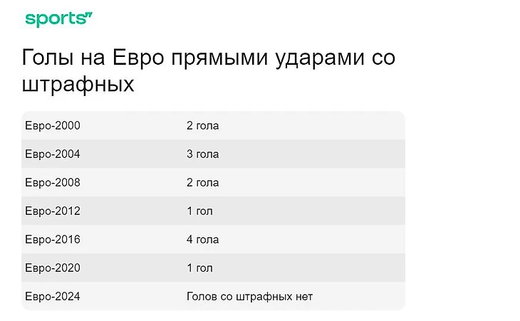 Это совсем не случайность. В 2021 году уже был всего один гол, хотя за пять лет до этого Гарет Бэйл, Балаж Джуджак и Эрик Дайер (в ворота России) забили суммарно четыре. Начиная с 1976 года, на всех Евро забивался хотя бы один мяч со штрафного, а ведь матчей долгое время было значительно меньше...