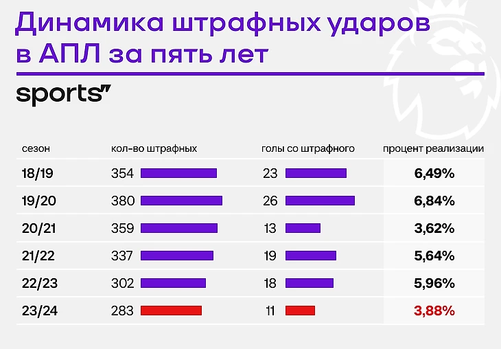 Грустят не только на чемпионате Европы, но и в АПЛ. В это трудно поверить, но за полный сезон-23/24 набралось лишь 11 голов прямыми ударами со штрафных. Только Фил Фоден забил больше одного.