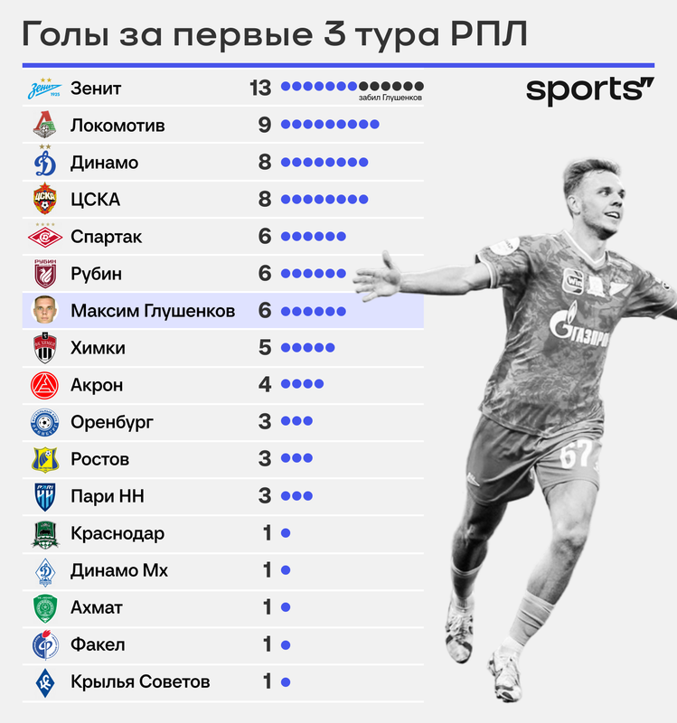 6 голов в 3-х матчах – безумие. Это столько же, сколько забили «Спартак» и «Рубин» по отдельности. Опережают Глушенкова только, конечно, сам «Зенит» (13 забитых мячей вместе с голами Максима), «Локомотив», московское «Динамо» и ЦСКА.