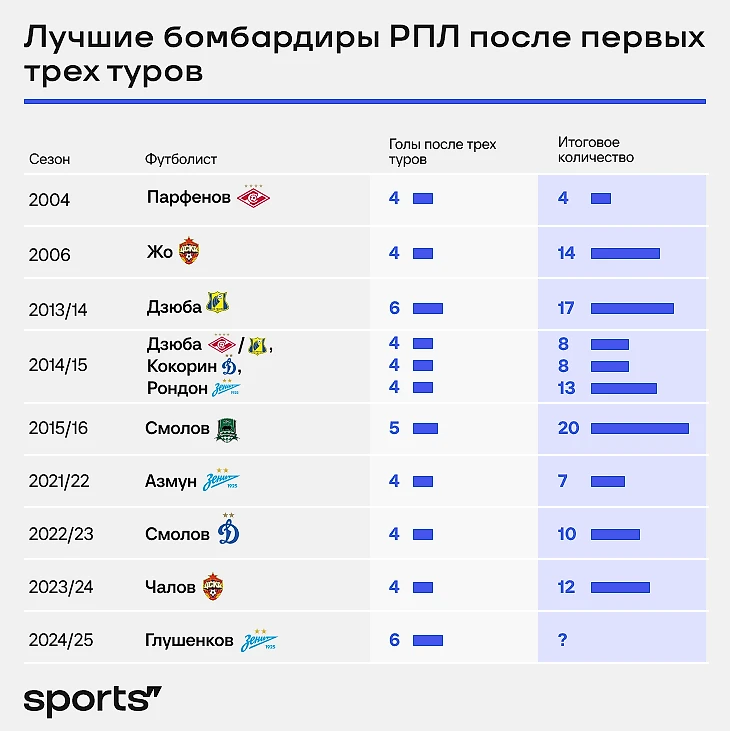 Как раз Максим Глушенков и повторил рекорд экс-форварда сборной России. До Дзюбы никто не забивал шесть голов в первых трех турах РПЛ. Выиграть бомбардирскую гонку это не помогло – отстал на один гол от Сейду Думбия (17 против 18).
