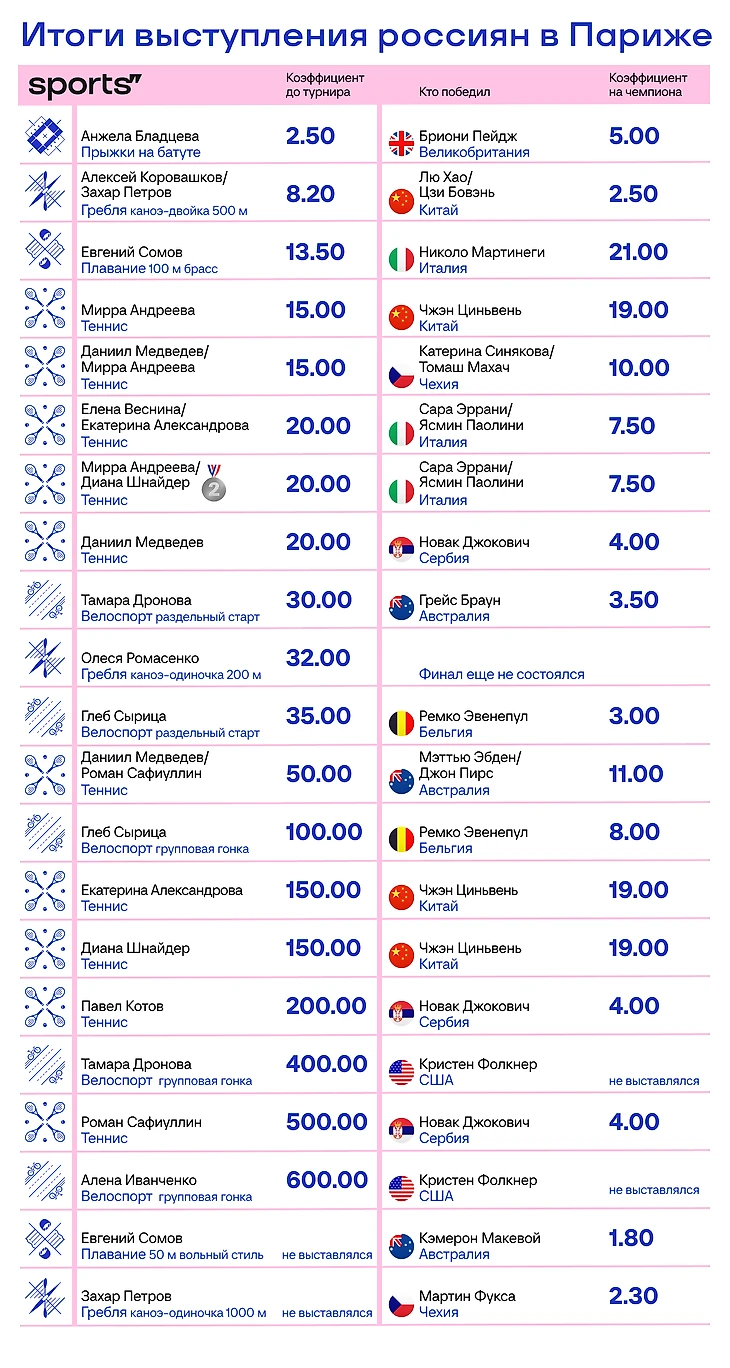 Олимпийские игры для россиян завершены. Всего в нейтральном статусе решились принять участие 15 спортсменов. До старта соревнований букмекерские компании предполагали, что россияне выиграют на всех хотя бы две медали. Коэффициент на это событие был 1.70. Прогноз не оправдался – главные фавориты от России до наград не дотянулись. Разбираем каждого атлета. Такими были коэффициенты до турнира.