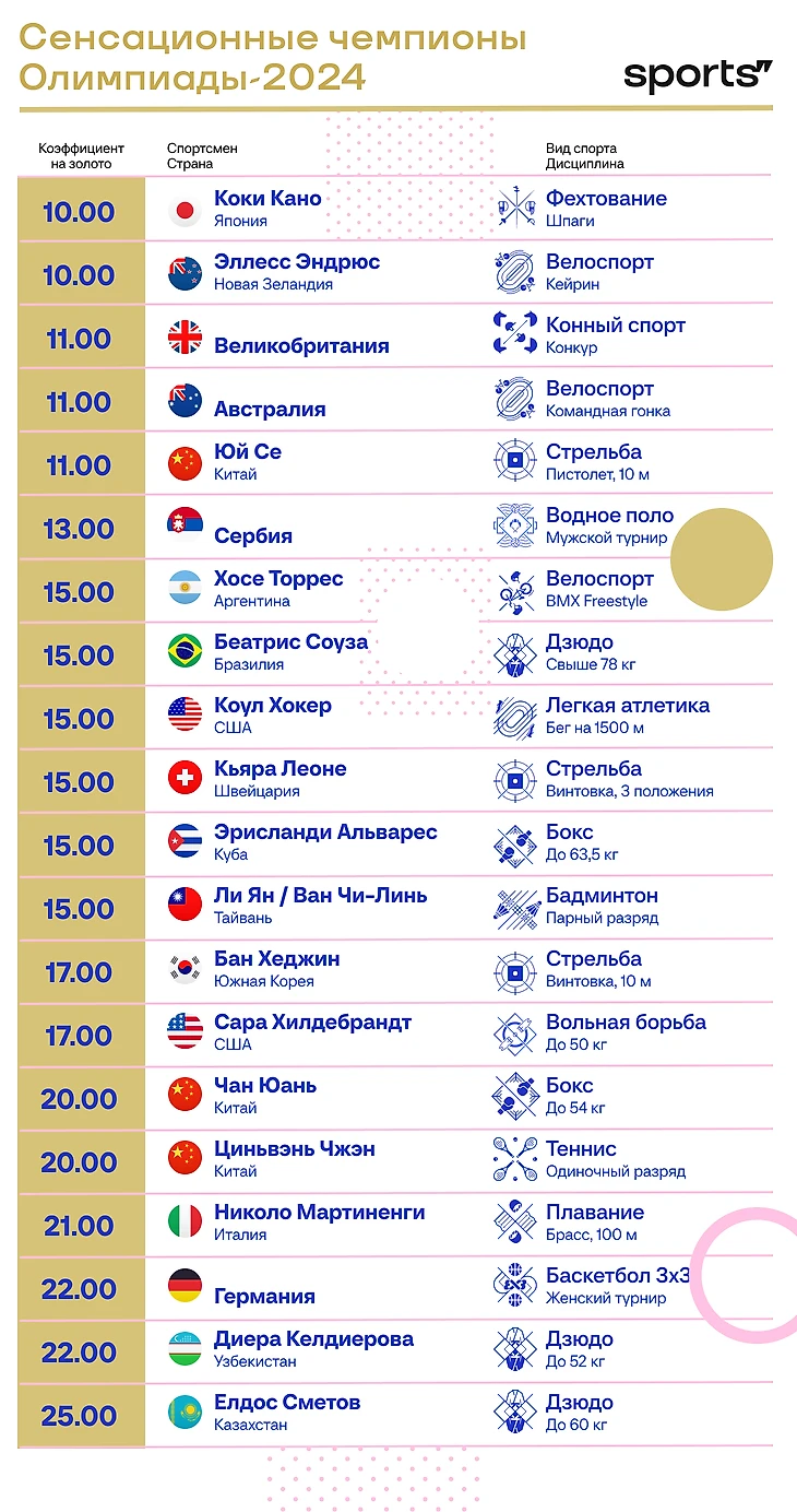 Сенсационные чемпионы – много ли их было на Олимпиаде-2024 в Париже? Мы сохранили предстартовые коэффициенты на победу и выделили всех спортсменов, кто получил не меньше 10.00 (около 10% вероятности на золото) – и выиграл.