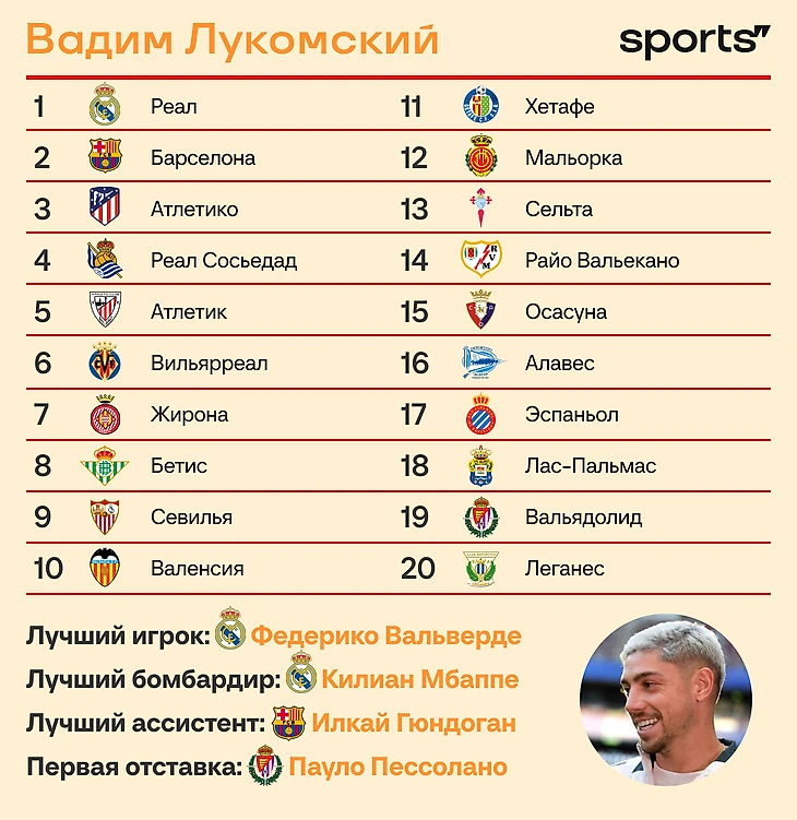 «Атлетик» ставлю на второе место. Рискованно, да, но многое совпало: во-первых, там не потеряли лидеров и оформили несколько хороших трансферов. Во-вторых, Эрнесто Вальверде, кажется, нашел правильные тактические рецепты. Еще причина – играют в ЛЕ, есть шанс ротировать состав.