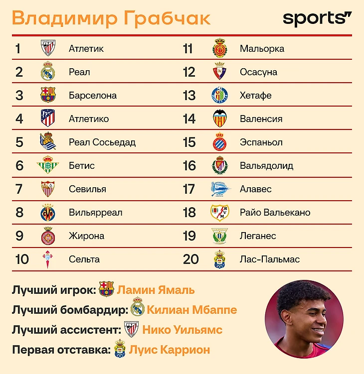 Лучший игрок: Ламин Ямаль («Барселона»). В Ла Лиге намечается масштабное противостояние атакующих футболистов. Ламин Ямаль мог играть вместе с Нико Уильямсом, но будет конкурировать с ним, как и с Винисиусом и Мбаппе, которые одновременно будут спорить между собой. Будет весело. Главная проблема – Ямалю всегда могут скинуть звание «лучшего молодого игрока чемпионата», а главную награду отдать более зрелому конкуренту.