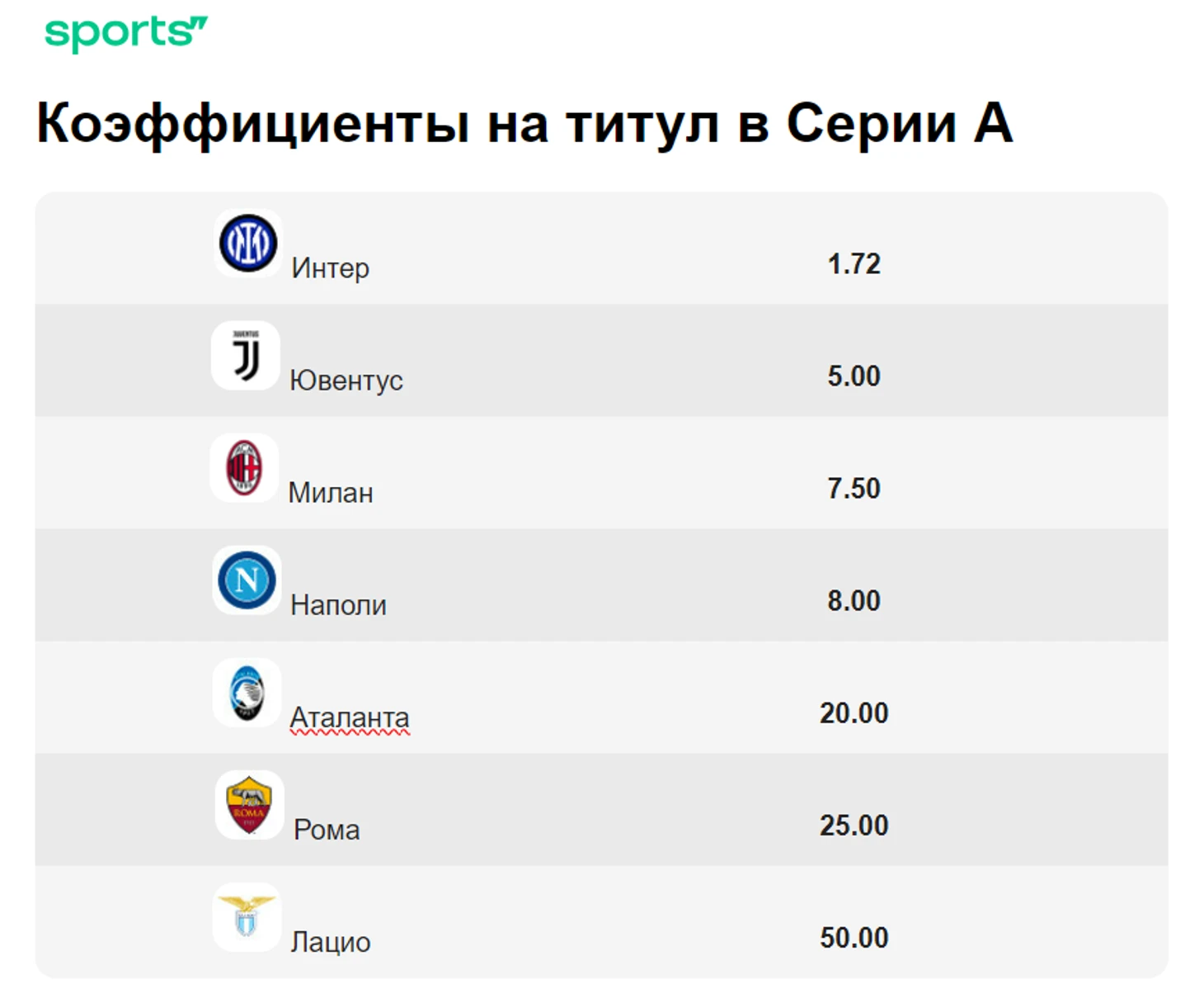 С «Интером» ясно – 1.04, но также мало сомнений в «Ювентусе» и «Милане» – 1.33 и 1.40 на них. На «Наполи» дают 1.60. Повыше – «Аталанта» за 2.50 и «Рома» за 2.75. До десятки есть еще «Лацио» – 7.00.