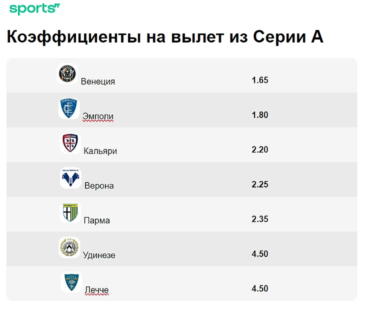 На вылет в Серии А идут три команды. Напомним, новички в этом сезоне – «Парма», «Венеция» и «Комо». Одна из этих команд считается аутсайдером, две другие должны уберечься от вылета, как это пока видится по котировкам: