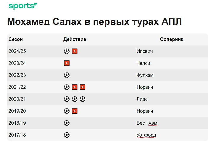 Для Салаха уже привычно начинать громко. Это его восьмой сезон в «Ливерпуле». Всего однажды он уходил с поля без забитого мяча в первом туре, но никогда – без результативного действия. Вот как это было: