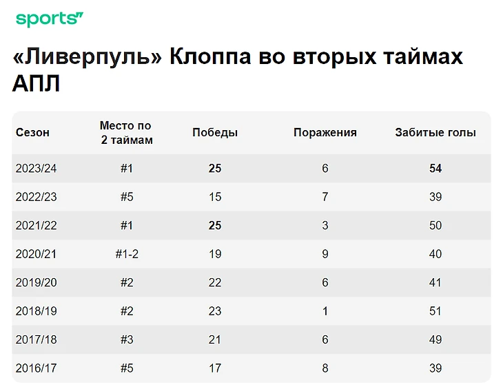 Было ли так раньше с Юргеном Клоппом, всегда ли «Ливерпуль» так хорошо прибавлял после перерыва? Вот таблица восьми его полноценных сезонов в клубе. Вторая колонка – это место команды в таблице вторых таймов среди всех участников АПЛ в конкретном сезоне.