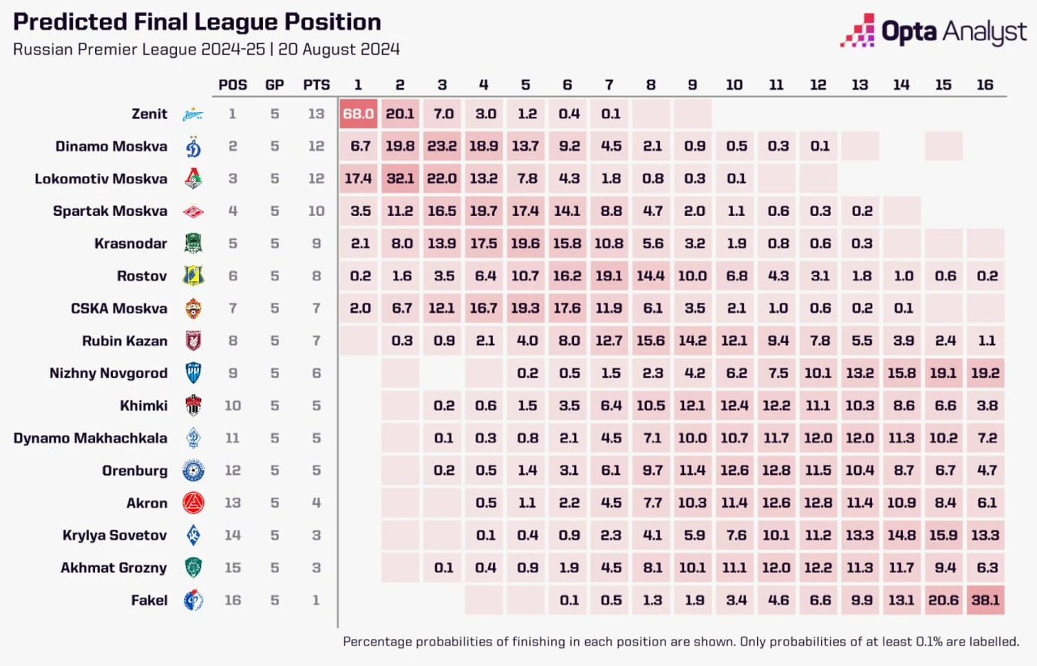 А вот как считает Opta: «Зенит» – явный фаворит, «Локо» поинтереснее «Динамо», «Спартак» пока не убеждает, а главный аутсайдер наряду с «Факелом» все же «Пари НН».