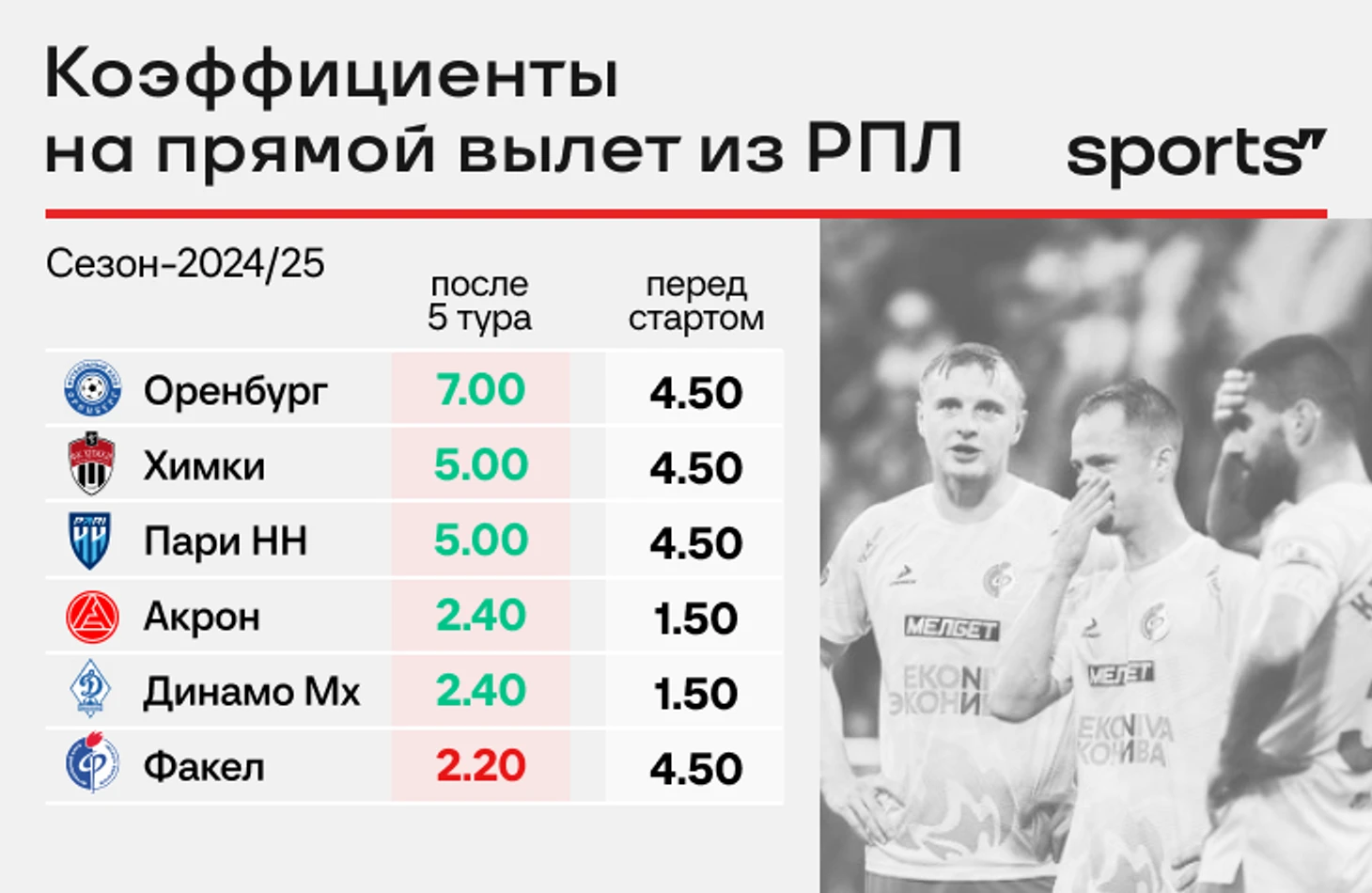 Интересно, что на «Оренбург» после первого тура (победа над «Спартаком») коэффициент дорос с 4.50 до 5.00, а после следующих четырех туров (всего два набранных очка) – до 7.00.