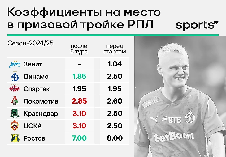 «Локомотив» очень бодро начал, всего однажды потеряв очки, но пока на раскладах это не отражается. Крупные победы «Спартака» коэффициент на него не двинули. Чуть приблизился «Ростов», хотя даже на старте в таблице он в четырех очках от третьего места.