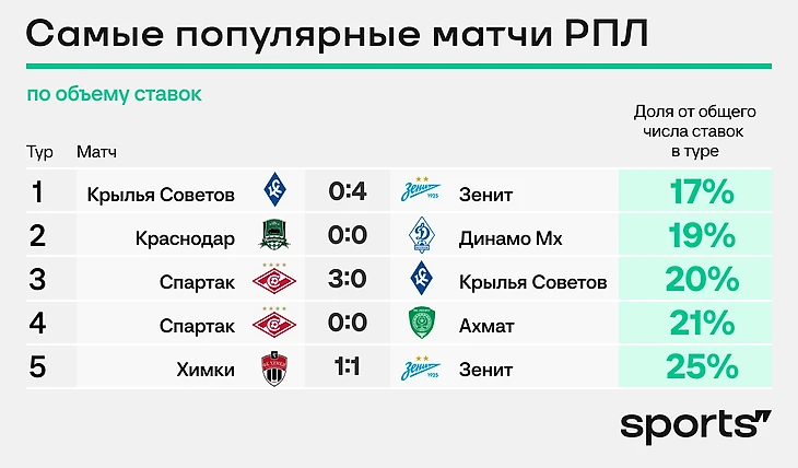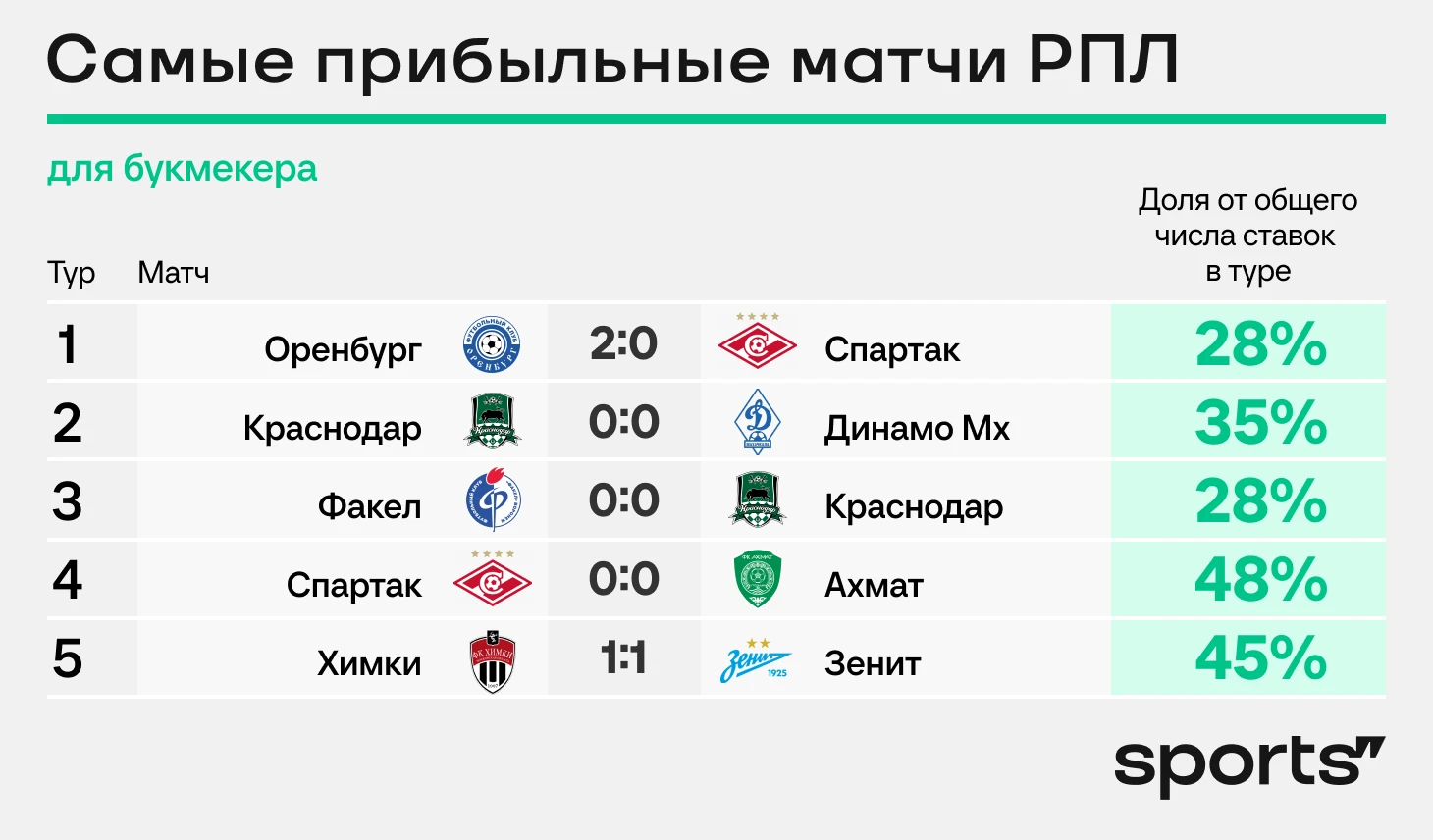 Итоги 5 туров РПЛ: ничья «Спартака» обогатила букмекеров, матч «Зенита» популярнее всех