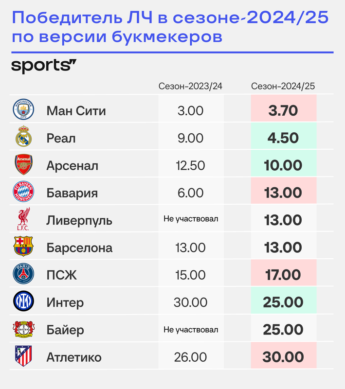 Команда Хаби Алонсо – восьмая, но делит позицию с финалистом сезона-2022/23 «Интером». И здесь же рядом уже, пожалуй, последние из реальных претендентов: «Атлетико» (30.00), «Боруссия» (40.00) и «Милан» с «Ювентусом (оба по 40.00).