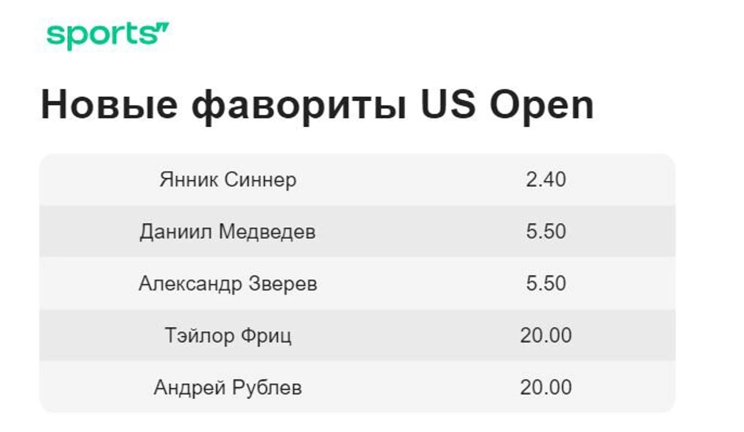 Очень любопытно выглядят новые коэффициенты. Медведев и Янник Синнер – это почти досрочный финал Открытого чемпионата США, по мнению букмекеров. Правда, есть важный нюанс – оба теннисиста до очного четвертьфинала еще не дошли. В новой версии Даниил Медведев получил 5.50 вместе с Александром Зверевым, а Янник Синнер красуется фаворитом за 2.40.