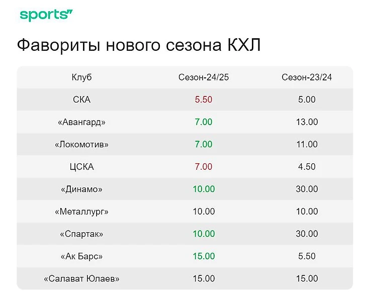 Подопечные Романа Ротенберга выделяются на фоне остальных в линии букмекерской компании БЕТСИТИ. Коэффициент на СКА в преддверии сезона равен 5.50. Для тренера это будет уже четвертая попытка завоевать Кубок Гагарина.
