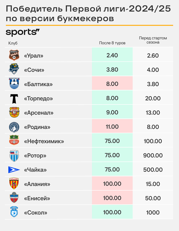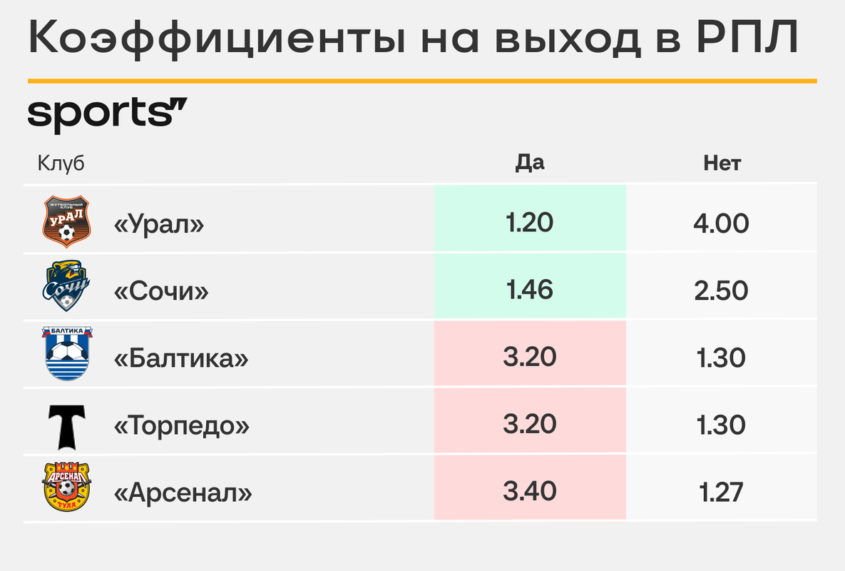 На «Урал» и «Сочи» аналитики выставили самые низкие котировки. Наверняка ожидают, что на екатеринбуржцев повлияет фраза министра спорта Свердловской области про расстрел, а сочинцы с самым дорогим составом в Первой лиге обязаны возвращаться в РПЛ.