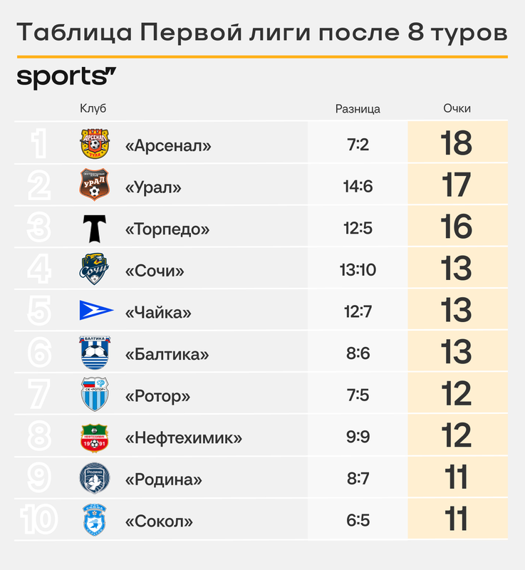 После 8 туров первым идет тульский «Арсенал», который в начале лета был близок к РПЛ, но проиграл в стыках «Пари НН».