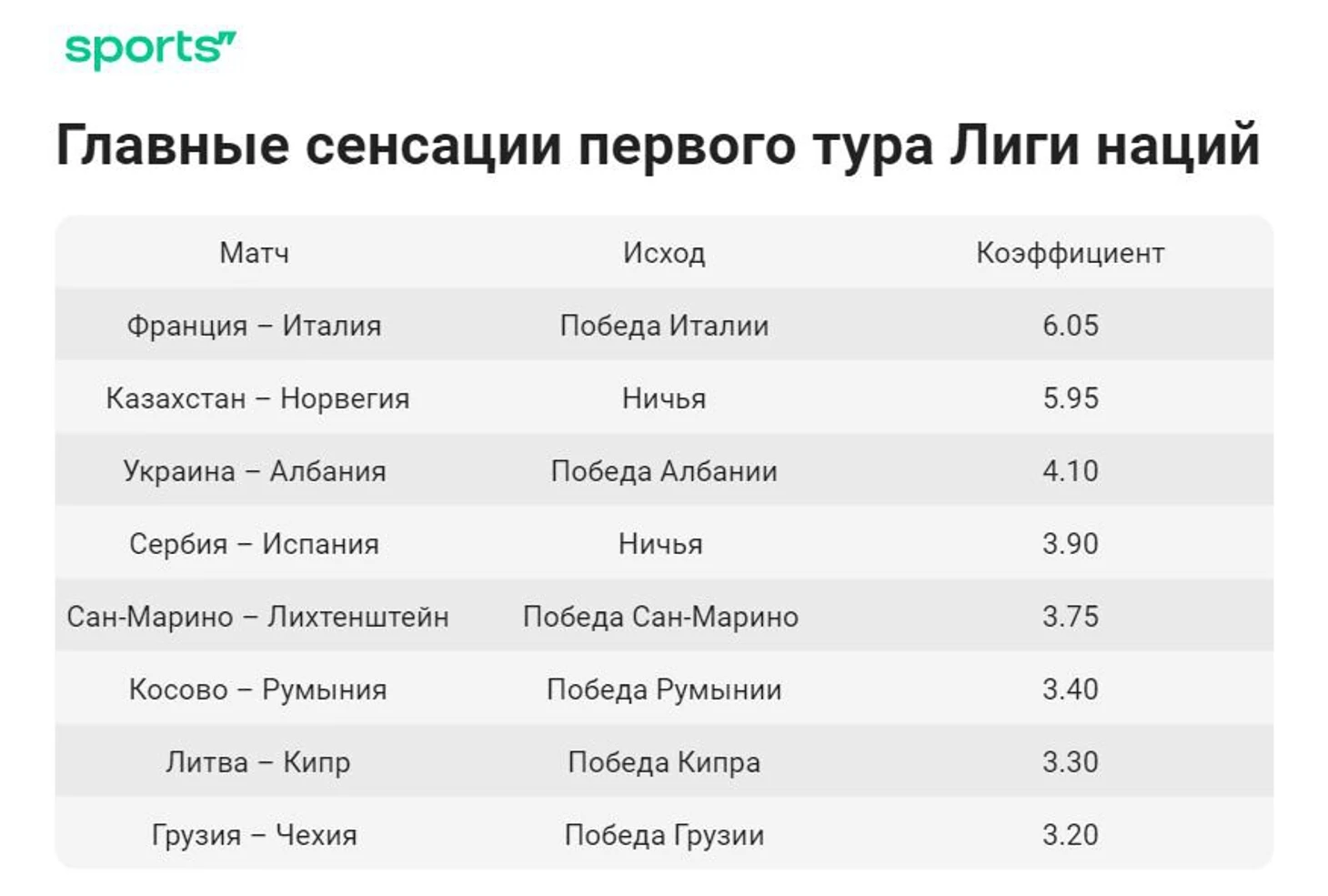 Лига наций традиционно является менее предсказуемым турниром, чем классические квалификации. Многие сборные выступают в экспериментальных составах и не ставят результат в приоритет. Даже с учетом этих обстоятельств первый тур получился сенсационным: в каждом дивизионе были победы явных аутсайдеров, проходили коэффициенты больше 10.00 и совершенно не оправдывались прогнозы аналитиков по тоталам.