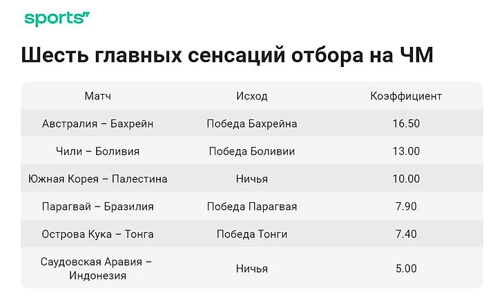 Нынешний отборочный турнир проходит по новой схеме в каждой из зон. На чемпионате мира 2026 года сыграют 48 команд. То есть многие сборные получили уникальную возможность прорваться на турнир мечты. А вот некоторые привычные гранды, напротив, расслабились и не выиграли матчи, в которых букмекеры выделяли их фаворитами за коэффициенты ниже 1.20. Разбираемся с главными сенсациями по котировкам.