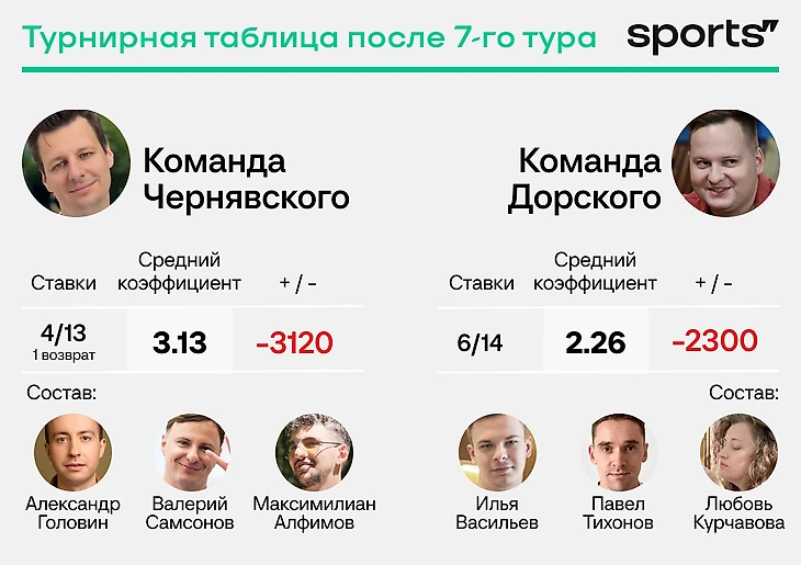 Соперничают две команды главных экспертов по российскому футболу: четверка Глеба Чернявского (Александр Головин, Валерий Самсонов, Максимилиан Алфимов) и дримтим Александра Дорского (Илья Васильев, Павел Тихонов и Любовь Курчавова).