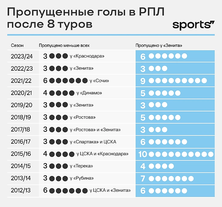 Если взять все сезоны по системе «осень-весна», к восьмому туру любая из команд пропускала минимум трижды. Иногда наименее пропускающим был сам «Зенит», но уж точно не с одним мячом.