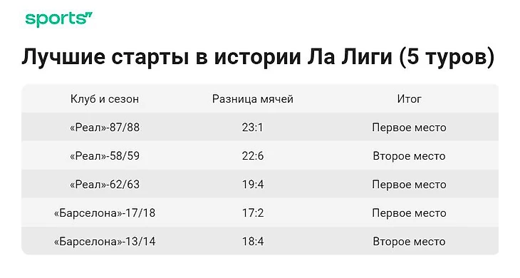 Пять матчей – пять побед и разница мячей 17:4 (+13). Так много на дистанции в первые пять туров «Барселона» не забивала даже в золотое время Пепа Гвардиолы. Вот лучшие старты клуба в чемпионате Испании.