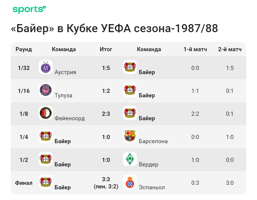 Так «Байер» выиграл Кубок УЕФА – первый и единственный еврокубок в истории клуба. Кто знает, отыгрались бы леверкузенцы в этом году с «Аталантой» с 0:3, если бы финал состоял из двух матчей.