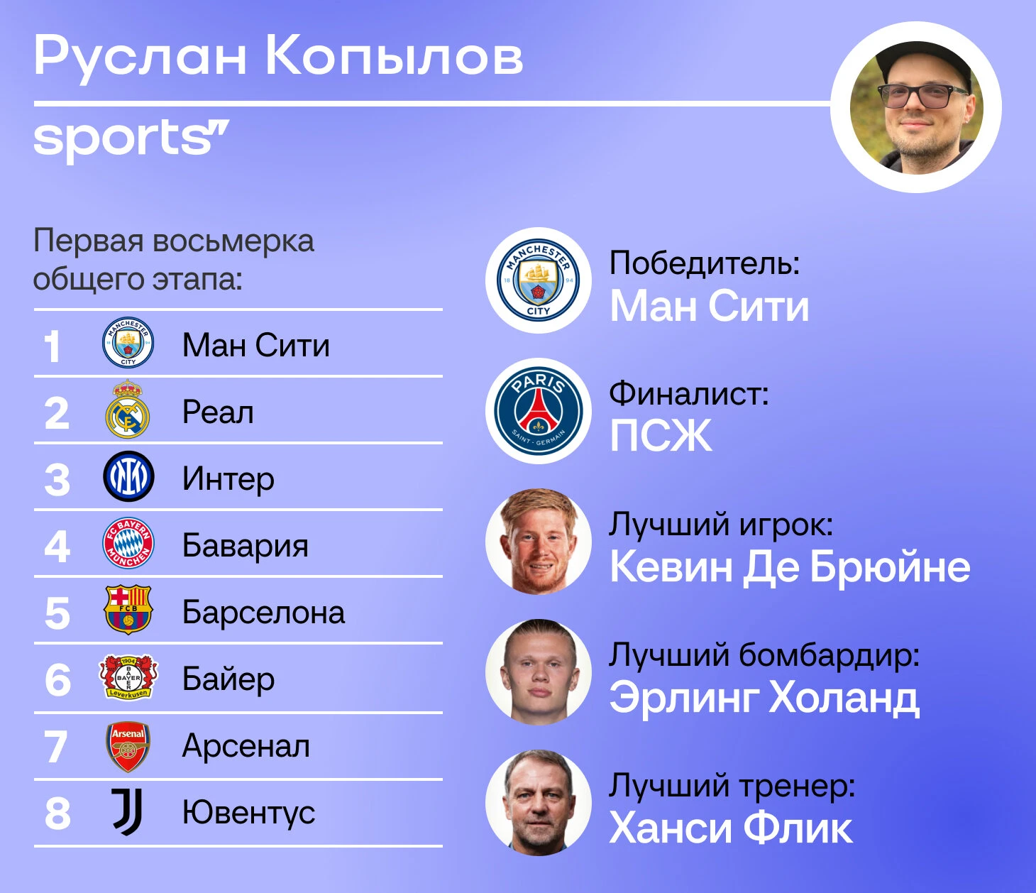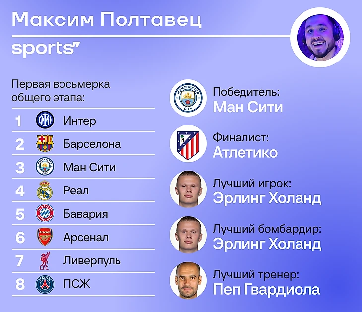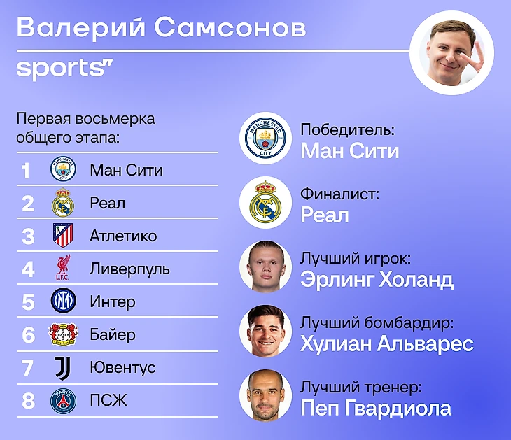 Авторы Спортса’’ уже готовы к новому сезону Лиги чемпионов: вот наши прогнозы. Мы выбрали первую восьмерку общего этапа (те, кто выйдут сразу в 1/8 финала, без дополнительного раунда), еще предсказали финалистов и лучших игроков/тренеров.