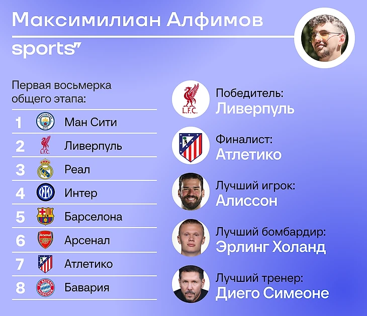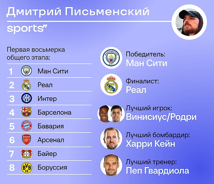 «Сити» и «Реал» просто не позволят себе упасть ниже определенного уровня, «Барселона» и «Бавария» высоко благодаря удобному календарю. «ПСЖ» и «Ливерпуль» с трудом, но пройдут непростое расписание. Немного алогично верю в «Интер»: кажется, что Индзаги пройдет общий этап с минимальными потерями, а проблемы начнутся в плей-офф.