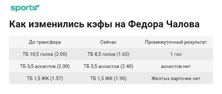 До матча шестого тура чемпионата Греции против «Ариса» Федору снизили индивидуальный тотал. Теперь можно ставить только на девять голов. В то же время аналитики сомневаются, что будет взята даже столь скромная отметка в греческой лиге – коэффициент 2.10 на ТМ 8,5. Снизились ожидания и по ассистам. Теперь даже четыре голевые от Чалова дадут выигрыш с коэффициентом 2.40.
